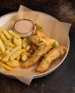 Ломтики куриной грудки в хрустящей панировке с картофелем фри и соусом Долмат.